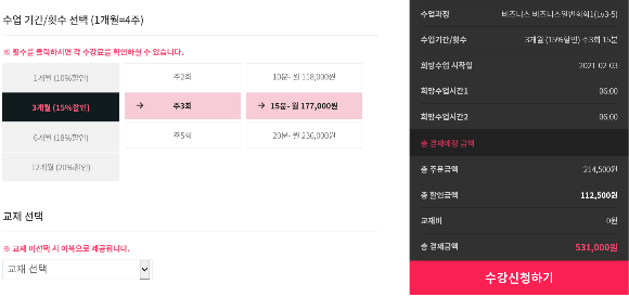 2. 하기와 같이 수강하고자 하는 조건을 설정하면 실제 결제금액이 자동 계산돼요.