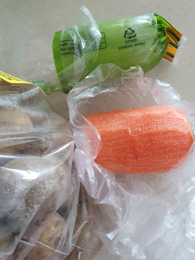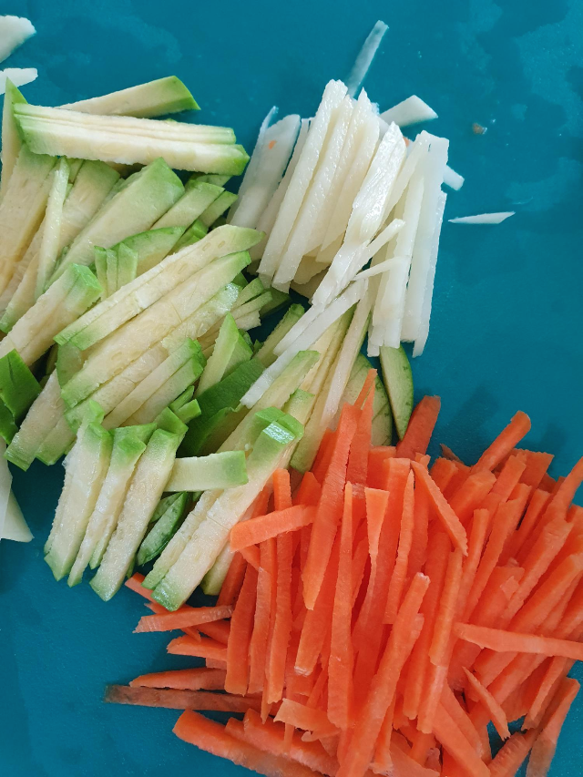 면을 넣고 끓이기 위해 애호박, 당근, 감자를 준비하여 썰어요. 먹기 좋은 크기로 채 썰어주시면 돼요.
