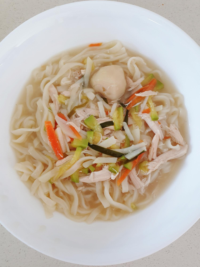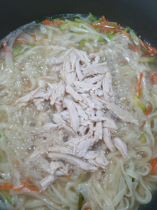 채소와 면이 어느 정도로 익으면 마지막에 손질해서 보관했던 닭고기 살을 넣어주시고 조금 더 끊이시면 돼요.