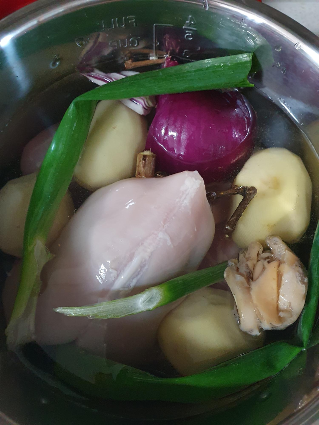 닭, 양파, 마늘, 대파, 대추, 백숙용 약재를 압력솥에 넣어 백숙을 만들었어요. 닭은 기름, 내장 제거 및 닭껍질도 손질하여 백숙을 만들었어요.
