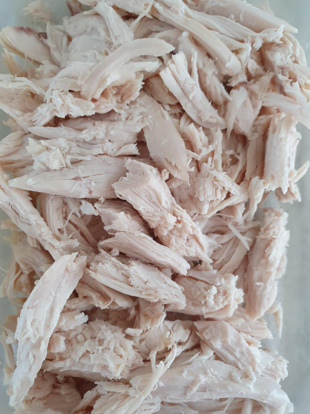 백숙을 만든 뒤 먹고 남은 육수를 보관하고, 닭도 뼈를 발라내어 보관했어요.