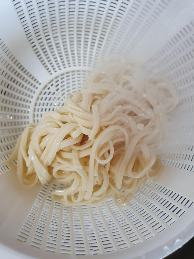 저는 마트에서 파는 칼국수 면을 사용했어요. 조리법에 칼국수 면을 흐르는 물에 10초간 가볍게 헹구어 전분을 씻으라고 되어있어서 면을 헹구어 주었어요