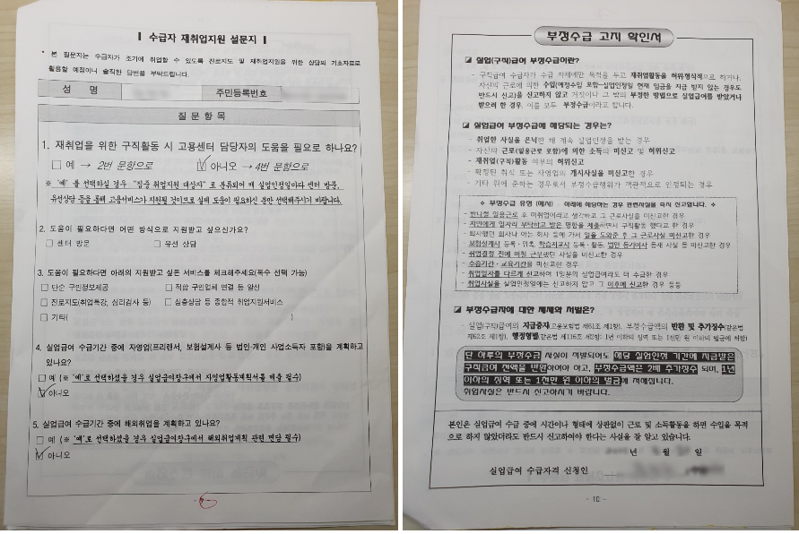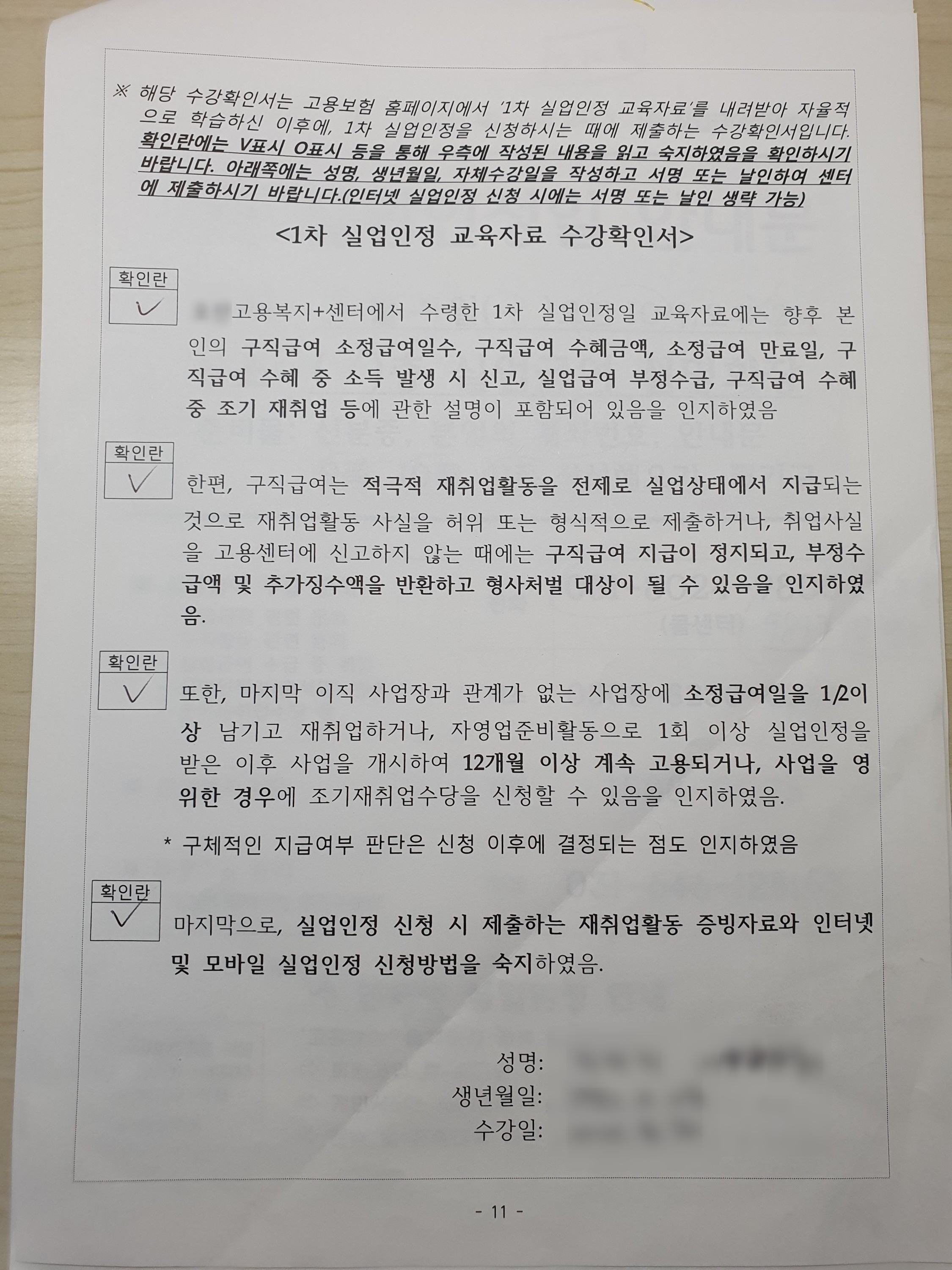 수강확인서와 재취업 설문지는 고용보험 사이트 공지사항에서도 다운로드할 수 있지만, 고용센터 수급자격 신청 위해 고용센터 방문하셔서 설명 들으실 때 관련 교육 자료를 주기 때문에 해당되는 페이지 작성하시면 돼요. 저는 아래와 같이 고용센터에 받은 자료 중 설문지(9페이지, 10페이지)와 수강 확인서(11페이지) 작성한 후 사진 첨부하여 전송했어요.