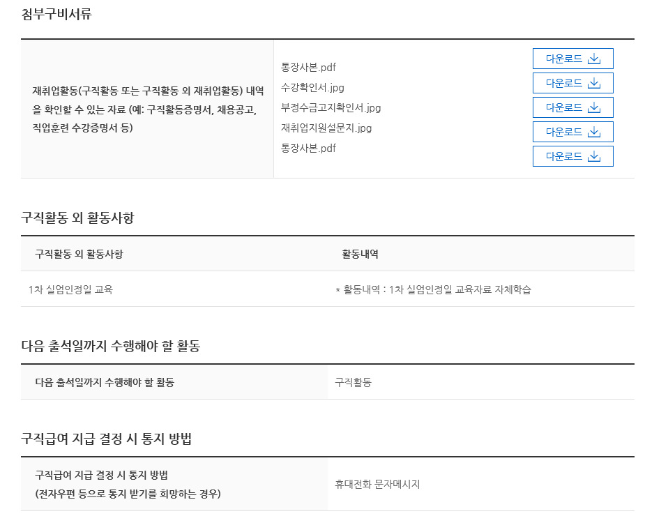 이렇게 코로나 관련 실업급여 보완지침에 따라, 1차 실업인정일에 인터넷 실업인정 신청을 하는 경우에는 반드시 구직활동 외 활동사항으로 1차 실업인정일 교육자료 자체학습 또는 1차 실업인정일 교육 동영상 수강을 해야 해요. 저처럼 교육자료 자체 학습을 한 경우에는 위와 같이 구직활동 외 활동사항에 1차 실업인정일 교육을 선택한 뒤 세부내역으로 1차 실업인정일 교육자료 자체 학습을 작성하고, 첨부 구비서류들 체크하셔서 제출하시면 돼요.