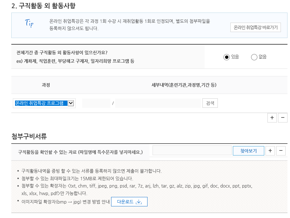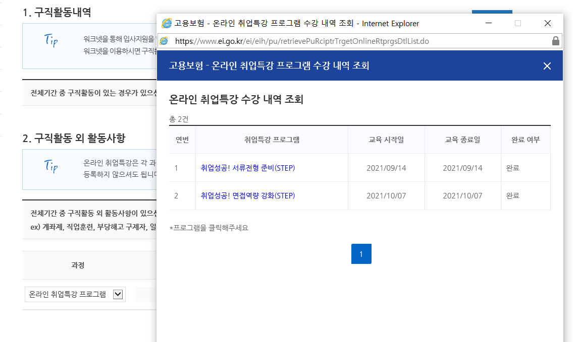 동영상 강의를 수강하였기 때문에 구직 외 활동사항에 있음을 체크하고 수강내역 조회되면 실업인정 대상 기간 내수 강 완료한 프로그램을 선택하시면 돼요. 앞서 말씀드렸지만 동영상 강의를 수강하였으면 첨부 구비서류가 필요 없어요.