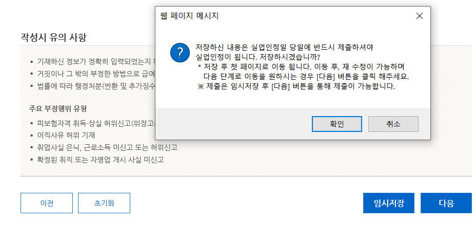 아래와 같이 미리 임시 저장 후 실업인정일 당일에 최종 확인 후 제출하시면 돼요.