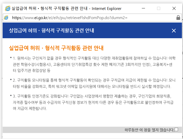 회차마다 고민하는 부분이 구직활동을 해야 하나, 아니면 구직 외 활동을 해야 하나 고민이 될 때가 있어요. 고용보험 사이트에 들어가서 실업인정 인터넷 신청을 클릭하니 아래와 같이 팝업창이 뜨더라고요. 원하는 구인처가 없을 경우 구직활동 대신 다양한 재취업활동에 참여한다는 글을 확인 후 저는 실업급여 3차 실업인 정도 2차에 이어서 구직 외 활동을 해보았습니다.
