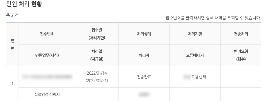 그리고 고용보험 사이트 민원처리 현황에서 아래와 같이 전송완료가 잘 되었는지 확인 가능해요.
