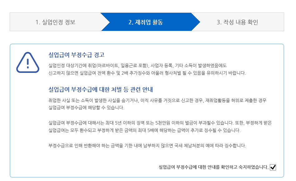 부정수급에 대한 안내를 확인하고 체크한 뒤 구직활동내역 또는 구직활동 외 활동을 작성하면 돼요. 동영상 강의를
