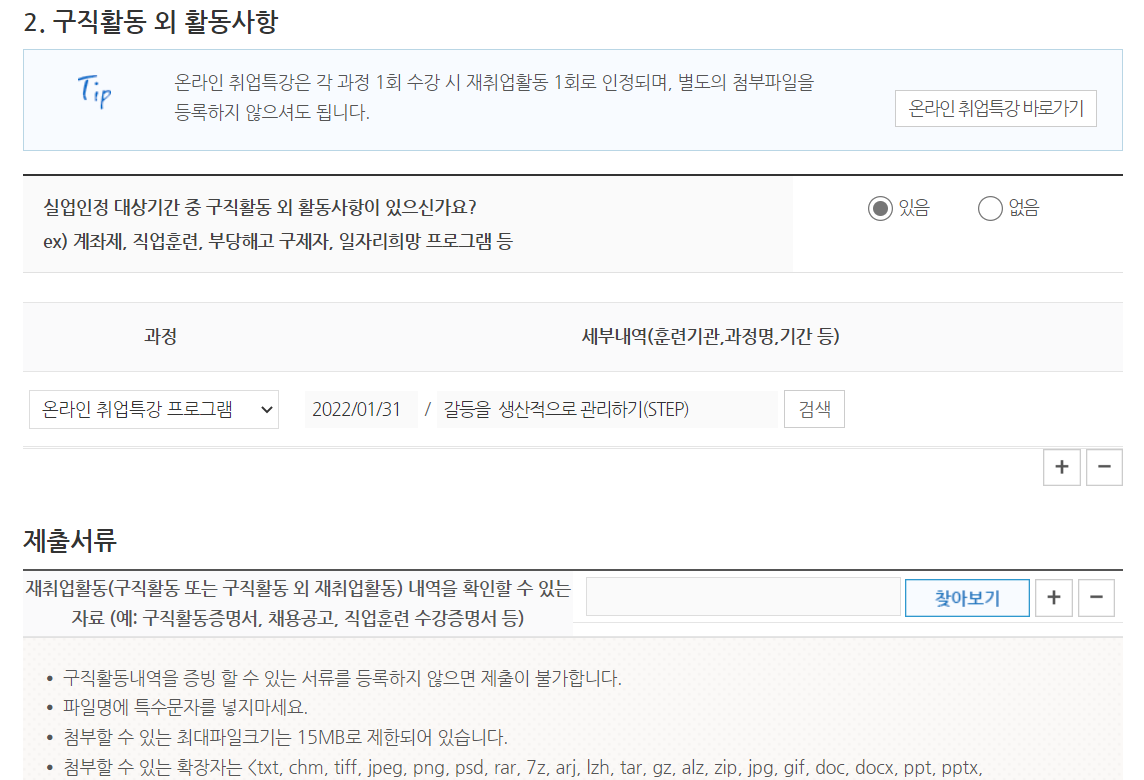 구직활동이 따로 없어서 구직활동 외 활동사항에 체크한 뒤 수강 내역을 조회하시면 돼요. 실업인정 대상 기간에 수강한 강좌를 클릭한 뒤 별도의 첨부 파일 등록은 필요 없습니다.