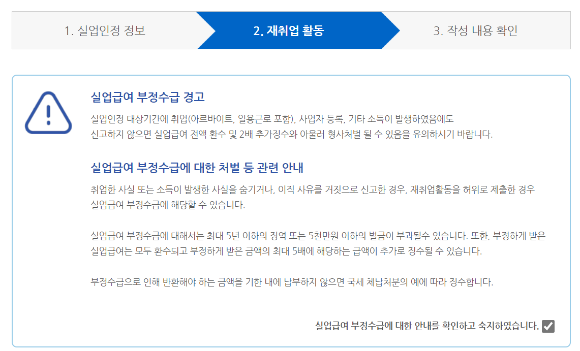 실업급여 부정수급에 대한 안내를 확인하고 체크해요. 그다음 구직 외 활동사항에서 온라인 취업특강을 클릭, 수강한 내역을 조회한 뒤 이번 회차에 들은 강좌를 체크하면 돼요.