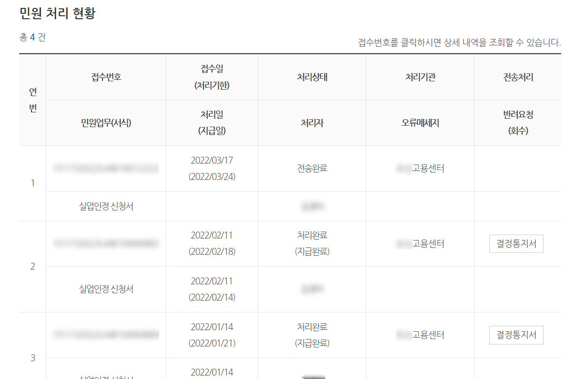 민원처리 현황에서 전송완료가 잘 되었는지 확인하면 돼요. 그리고 인터넷 전송 후 보완할 사항이 있으면 담당 센터에서 연락이 오기 때문에 실업인정일 오전 중에 전송하세요.
