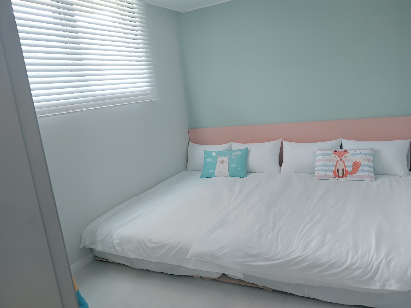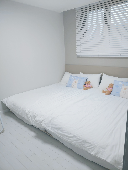 방은 현관 가까운 곳에 첫 번째 룸이 있고 조금 더 들어가면 두 번째 룸이 있어요. 아이들이 떨어지지 않게 더블베드 2개가 놓여 있어요. 침대가 저상형이라서 아이들 자기 좋았어요. 두 개의 침대방 모두 뒹굴뒹굴하며 4인 가족이 자기 충분해요. 각 방마다 TV도 있어요. 해적선방, 산호방 등 평수가 더 큰 곳을 예약하여 여러 가족이 같이 와도 좋을 것 같다는 생각을 했어요.