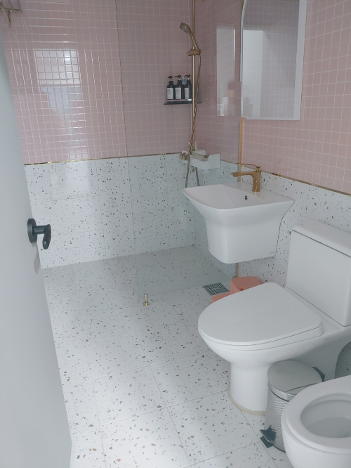 화장실이에요. 화장실도 깔끔했어요. 세면대 마개가 닫혀 있어서 물이 안 빠져서 어떻게 열어야 하는지 처음에 조금 헤맸는데 마개 부분을 만져서 눌러야 열리더라고요. 키즈 샴푸, 바쓰 다 있고, 아기 변기도 따로 있었어요.