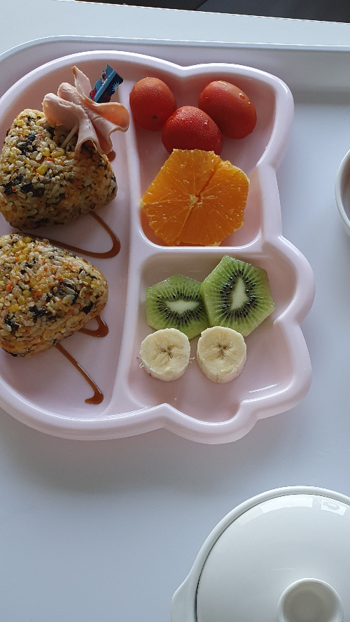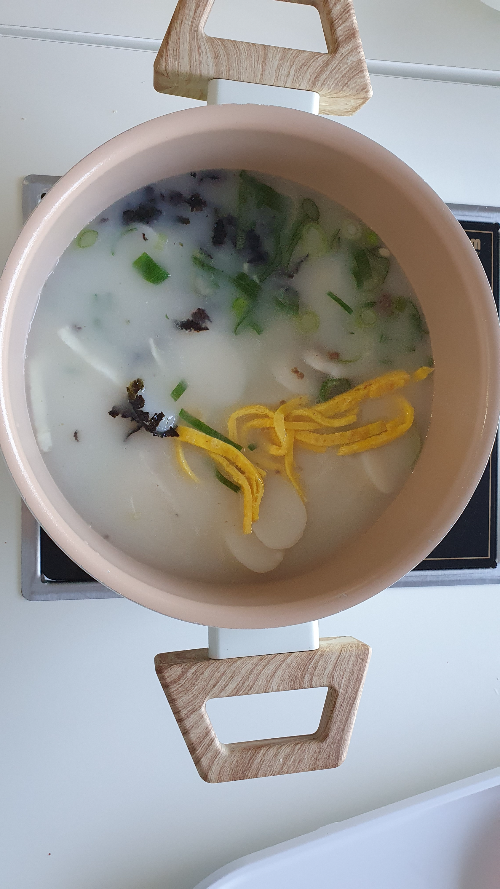 다음날 9시 20분경 조식을 갖다 줬어요. 떡국과 주먹밥이 나왔는데, 무료 조식 서비스가 있어서 아침에 편했어요.
