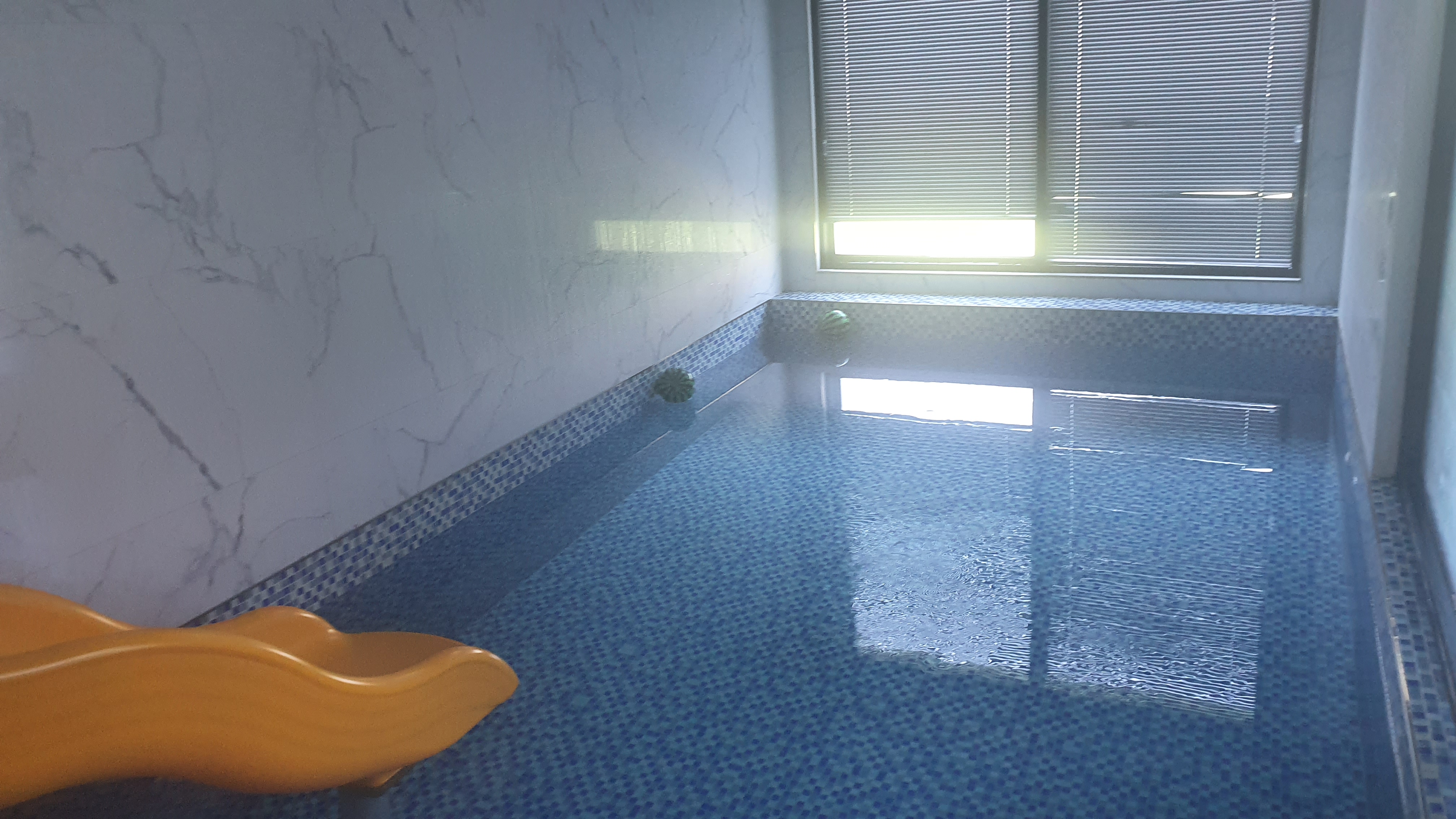 그리고 아이들이 제일 신나게 놀았던 곳, 풀빌라 안의 개별 수영장이에요. 통창이 있는 수영장은 넓었고 안에 미끄럼틀도 있어요. 아이들이 미끄럼틀을 한번 타더니 계속 미끄럼틀을 타며 놀았어요. 무한 반복! 저희는 개별 수영장에서 즐겁게 많은 시간을 보냈답니다. 예약 시 옵션 선택에 미온수 이용이 있는데 온도 33도는 5만 원, 35도는 7만 원이었어요. 물 온도에 따라 요금이 부과되는 게 조금 그렇더라고요. 요즘 날이 더워서 33도로 놀아도 충분해요. 개별 수영장 밖의 옆 입구에는 수건, 드라이기, 휴지가 비치되어 있어요. 수건이 넉넉하게 있어서 좋았어요.