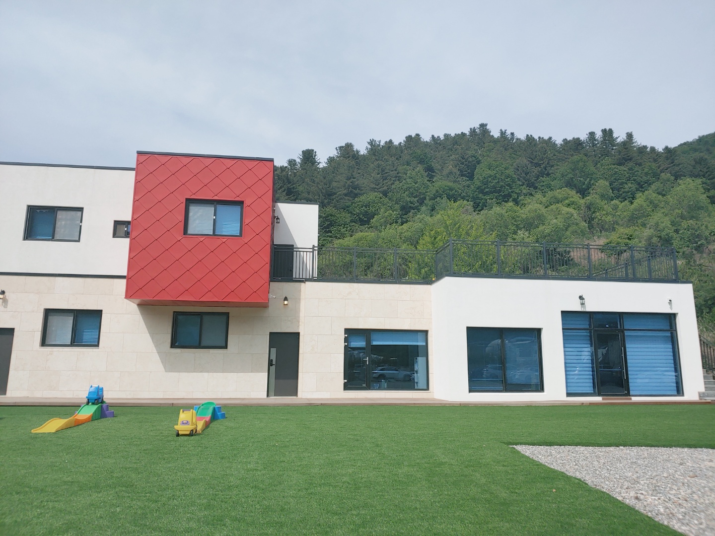당일, 가평 삐삐 키즈 풀빌라 도착! 넓은 야외 잔디 광장이 펼쳐져 있었어요. 일단 먼저 사무실로 가서 체크인했어요. 체크인 시간인 3시보다 10여 분 정도 늦게 도착했는데 다른 팀들은 벌써 도착해서 야외 놀이터를 이용하고 있더라고요. 가평 나들이할 때마다 느끼지만 펜션들이 많은데 오는 길 주변에 공사 중인 곳이 많았어요.
