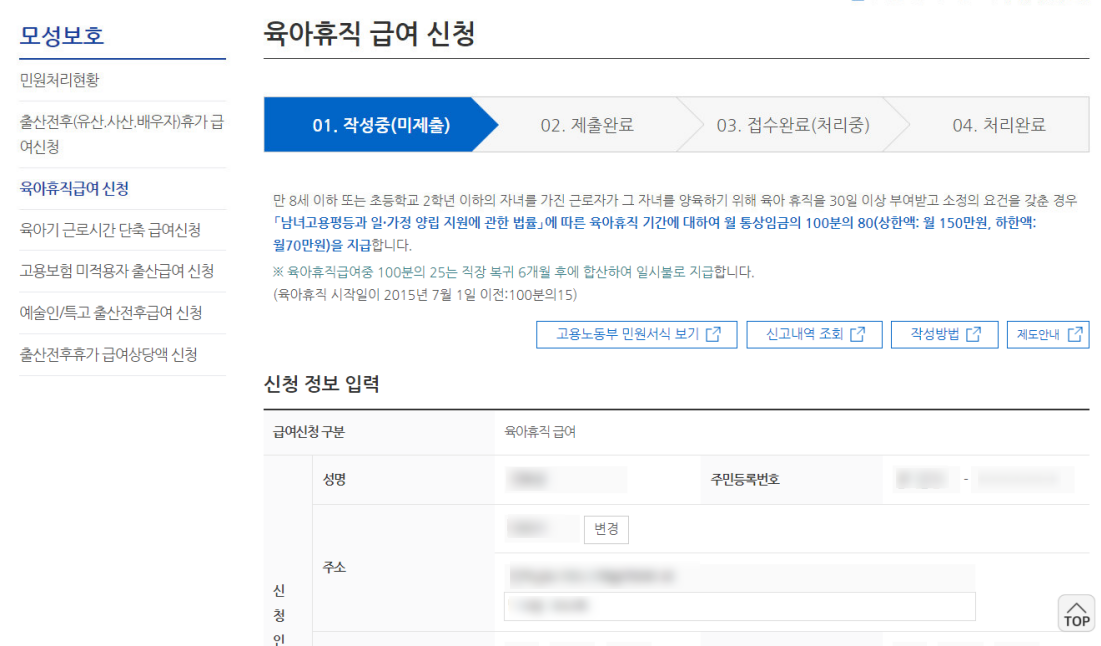 2. 육아휴직급여 신청 클릭 후 신청 내용 작성