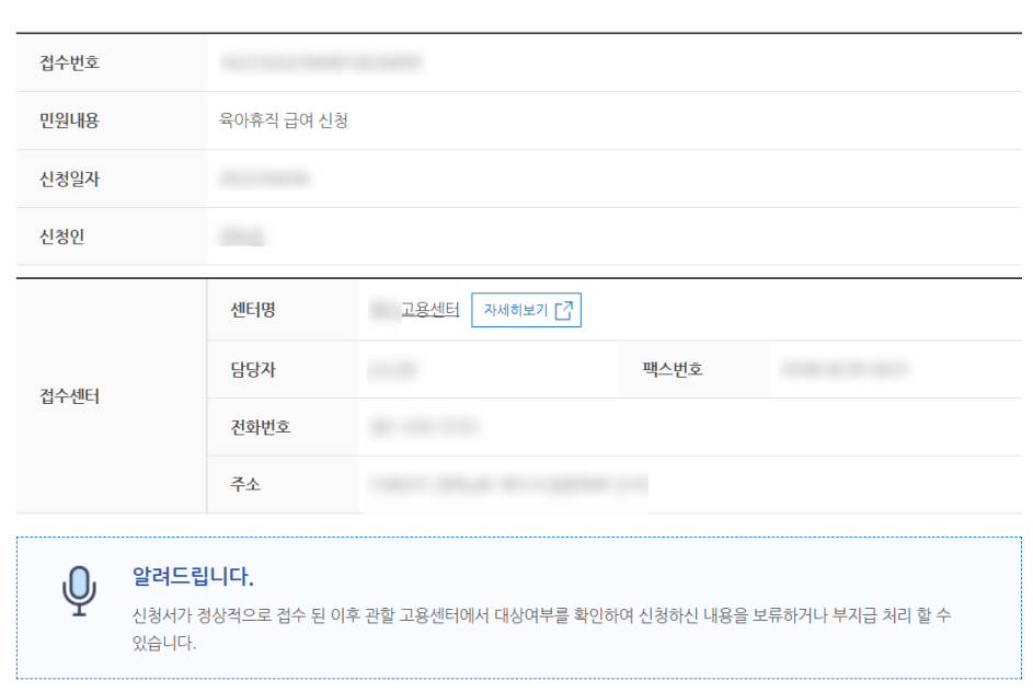 육아휴직 급여 신청이 완료되면 민원처리 현황에서 아래와 같이 확인할 수 있어요.