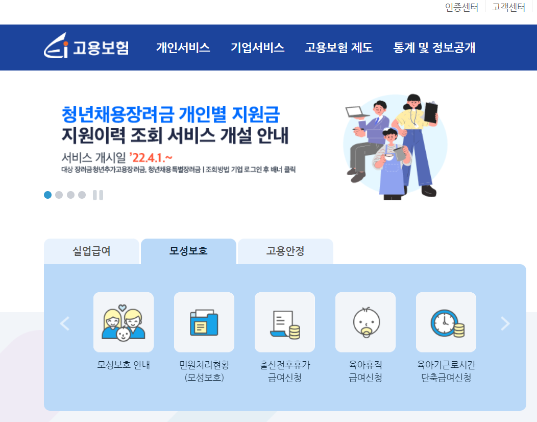 1.고용보험 사이트- 모성보호 클릭 - 로그인
