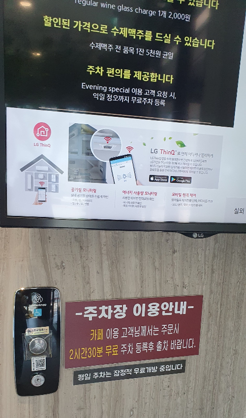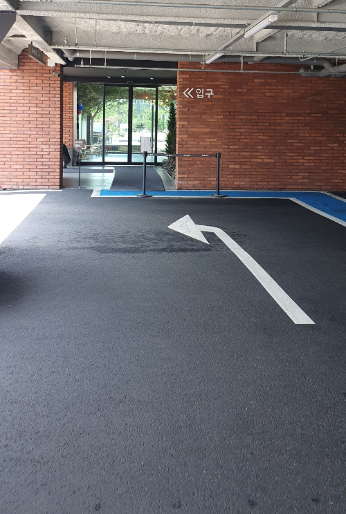 대형 카페이어서 그런지 주차장이 넓어서 주차 공간이 많아요. 필로티 건물로 되어 있는 카페라서 필로티 아래의 주차 공간은 더운 날에는 그늘이라서 좋고 비가 올 때는 비를 맞지 않고 아이들을 케어할 수 있다는 점이 좋아 보였어요. 무료 주차 시간은 2시간 30분이었어요. 주문 시 주차 등록하면 돼요. 차에서 내려서 입구라고 표시된 곳으로 들어갔어요.