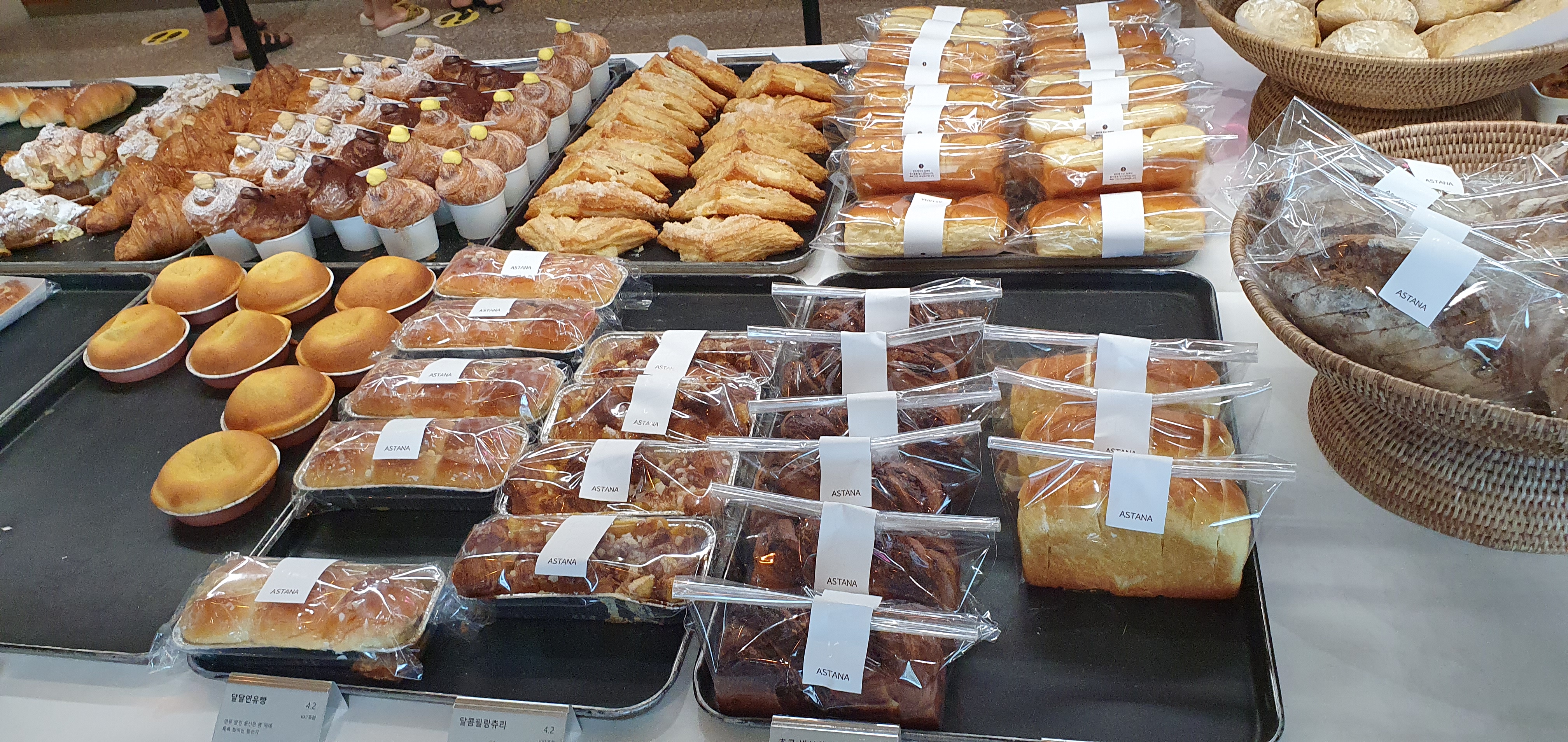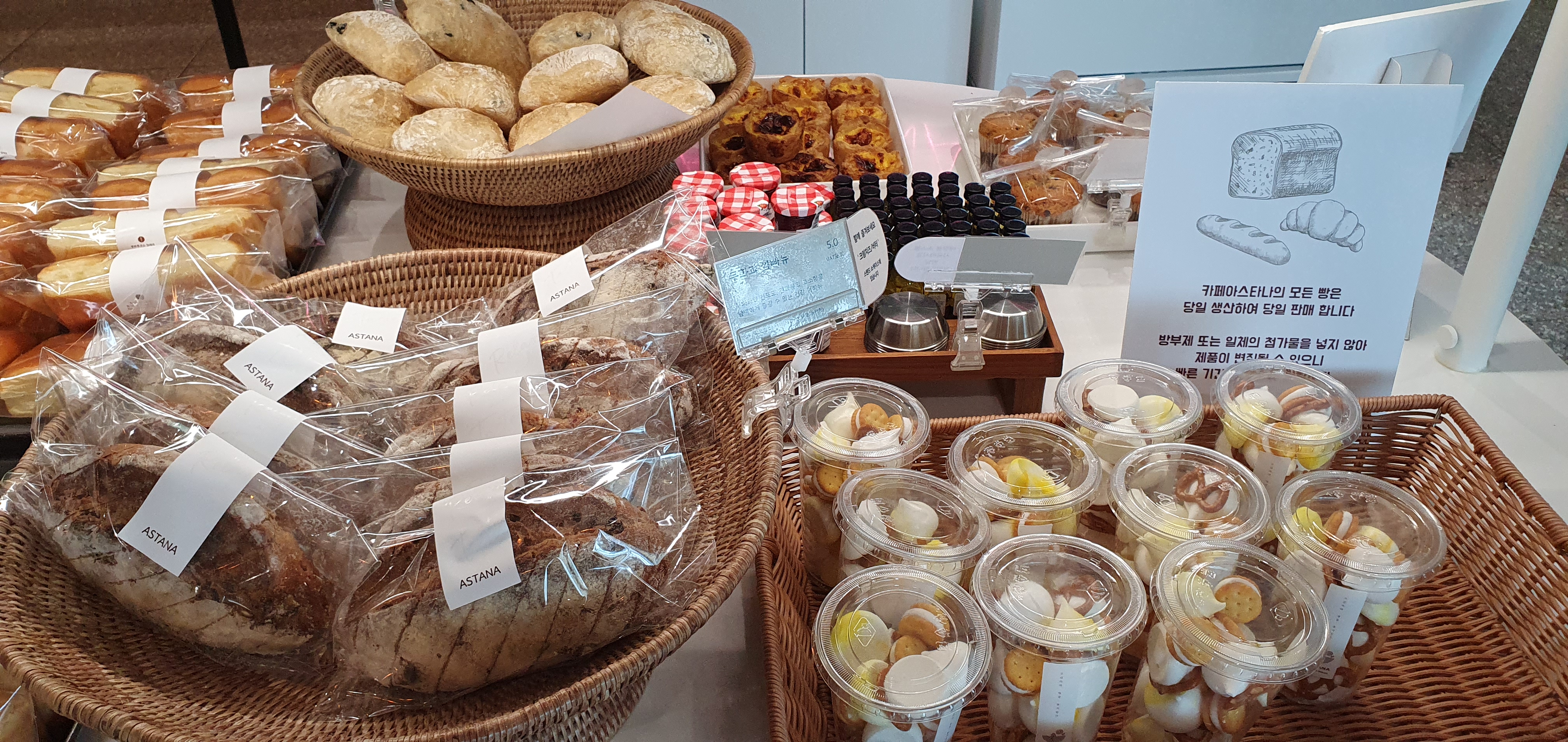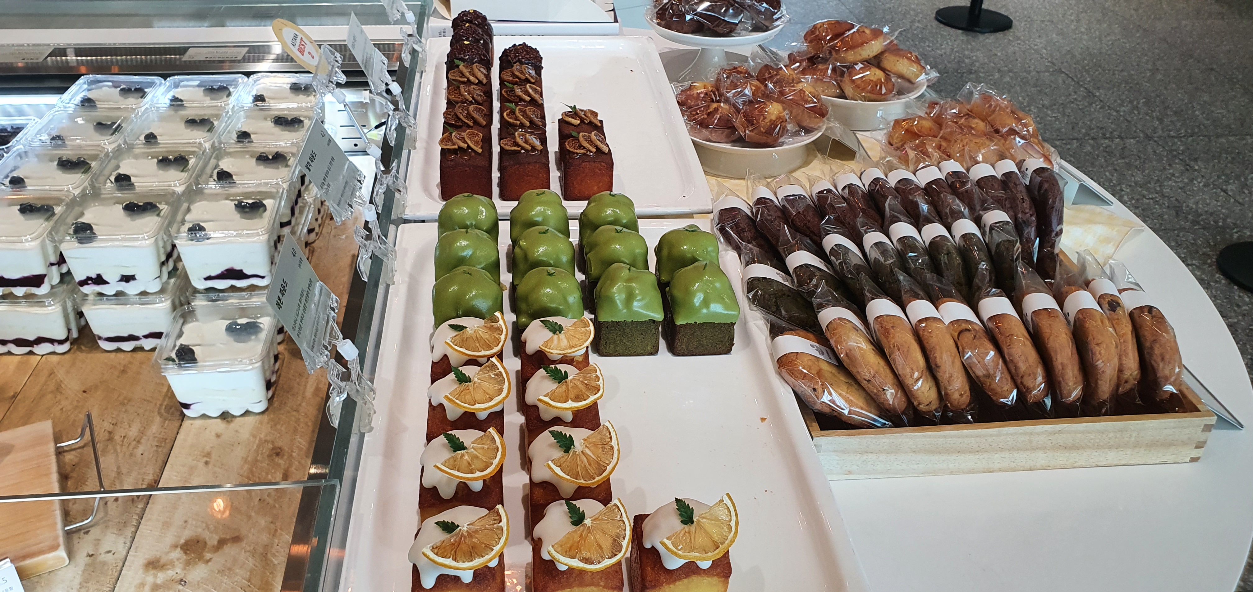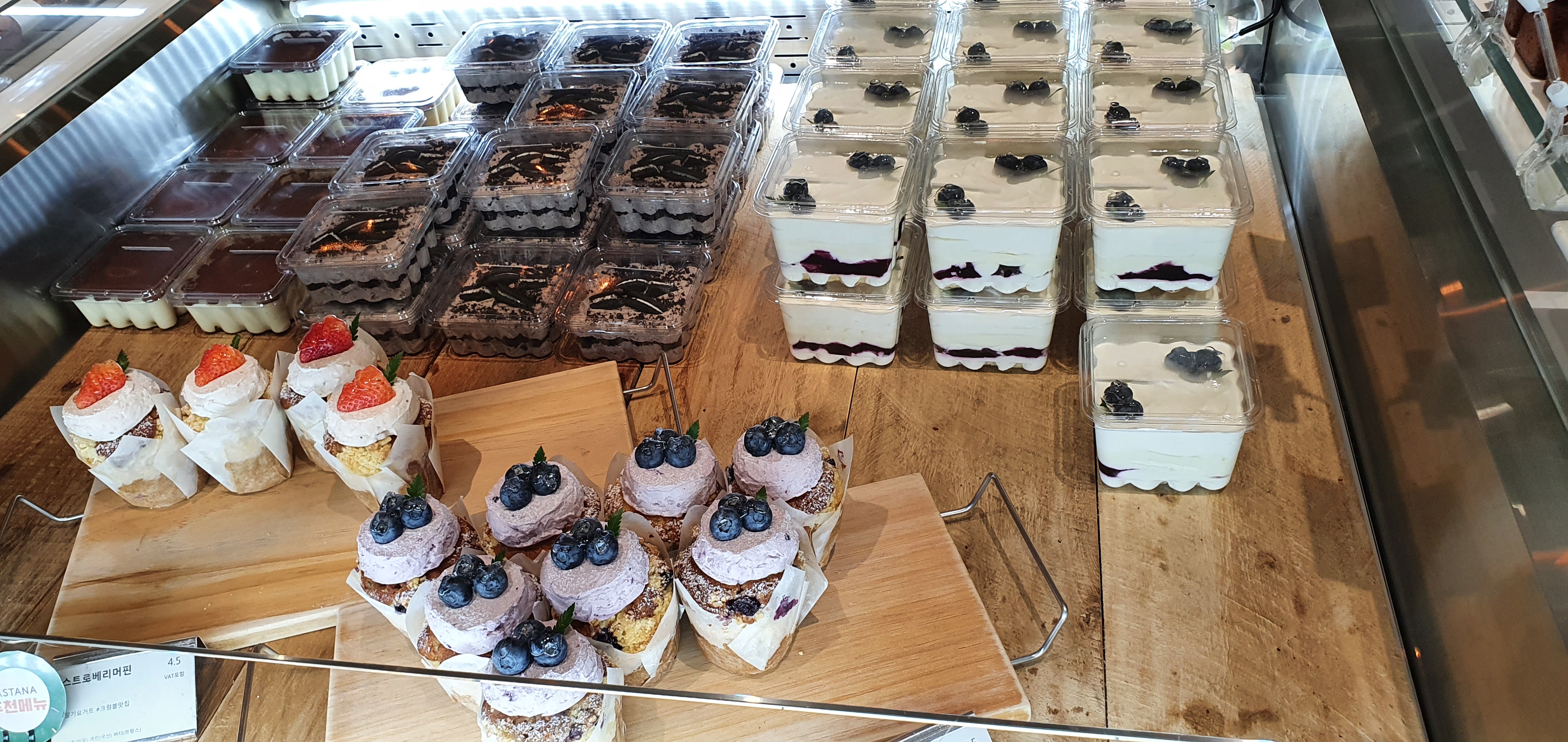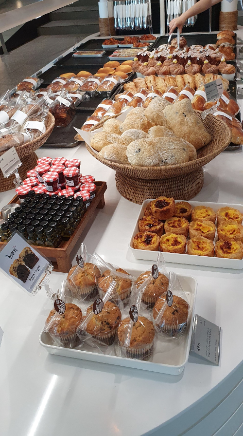 베이커리 메뉴도 많이 있어요. 다양한 종류의 빵들이 진열되어 있어요. 브런치 메뉴와 맥주도 있고, 디저트류의 케이크와 쿠기도 있어요. 아이들이 먹을 수 있는 우유도 있어요.