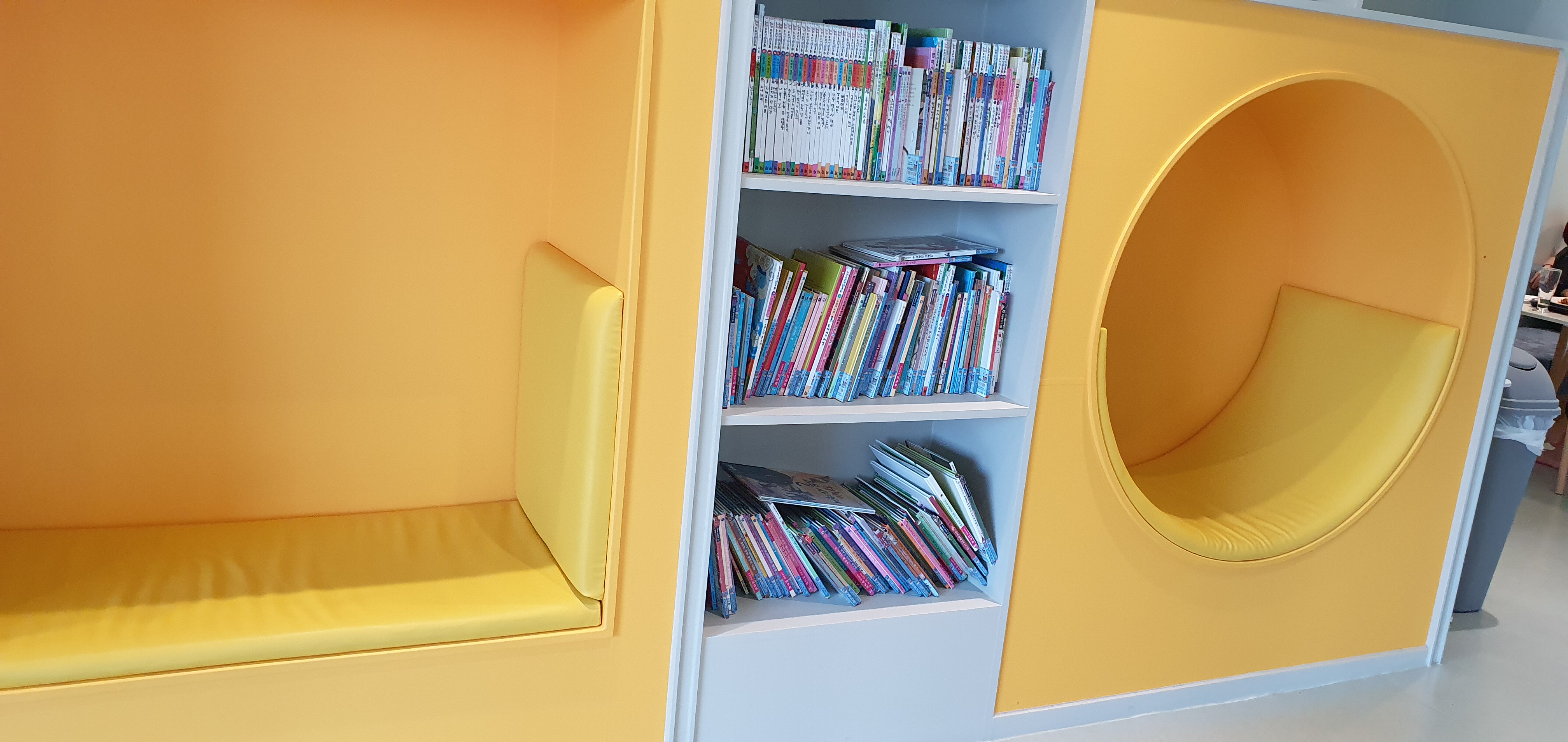 한쪽 벽면에는 책과 책 읽는 공간도 있었어요.