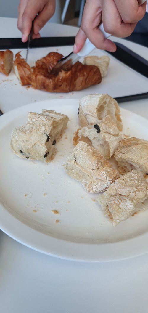 종류가 다양하여 무엇을 먹어볼까 고민하다 저희는 음료로 아메리카노와 그린티라떼를, 브런치 메뉴는 토마토바질 피자 그리고 빵은 크루아상, 올리브 치아바타를 주문했어요. 아이들도 맛있게 잘 먹고, 빵이 저희 입맛에도 담백하고 맛있었어요.
