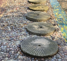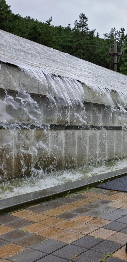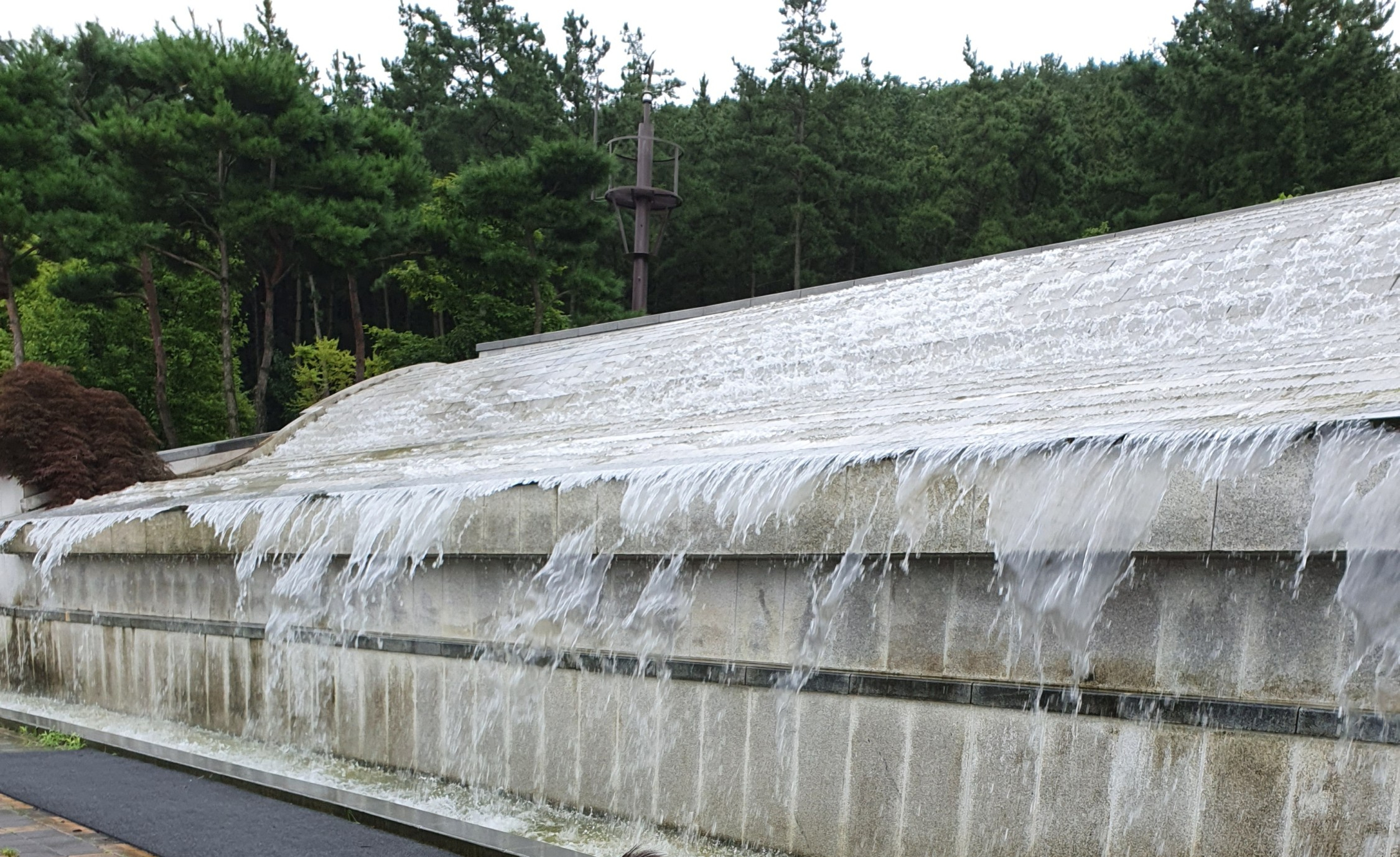 입구에 들어서자마자 벽천에서 흐르는 시원한 물줄기가 보여요. 벽천 폭포 조형물이에요.