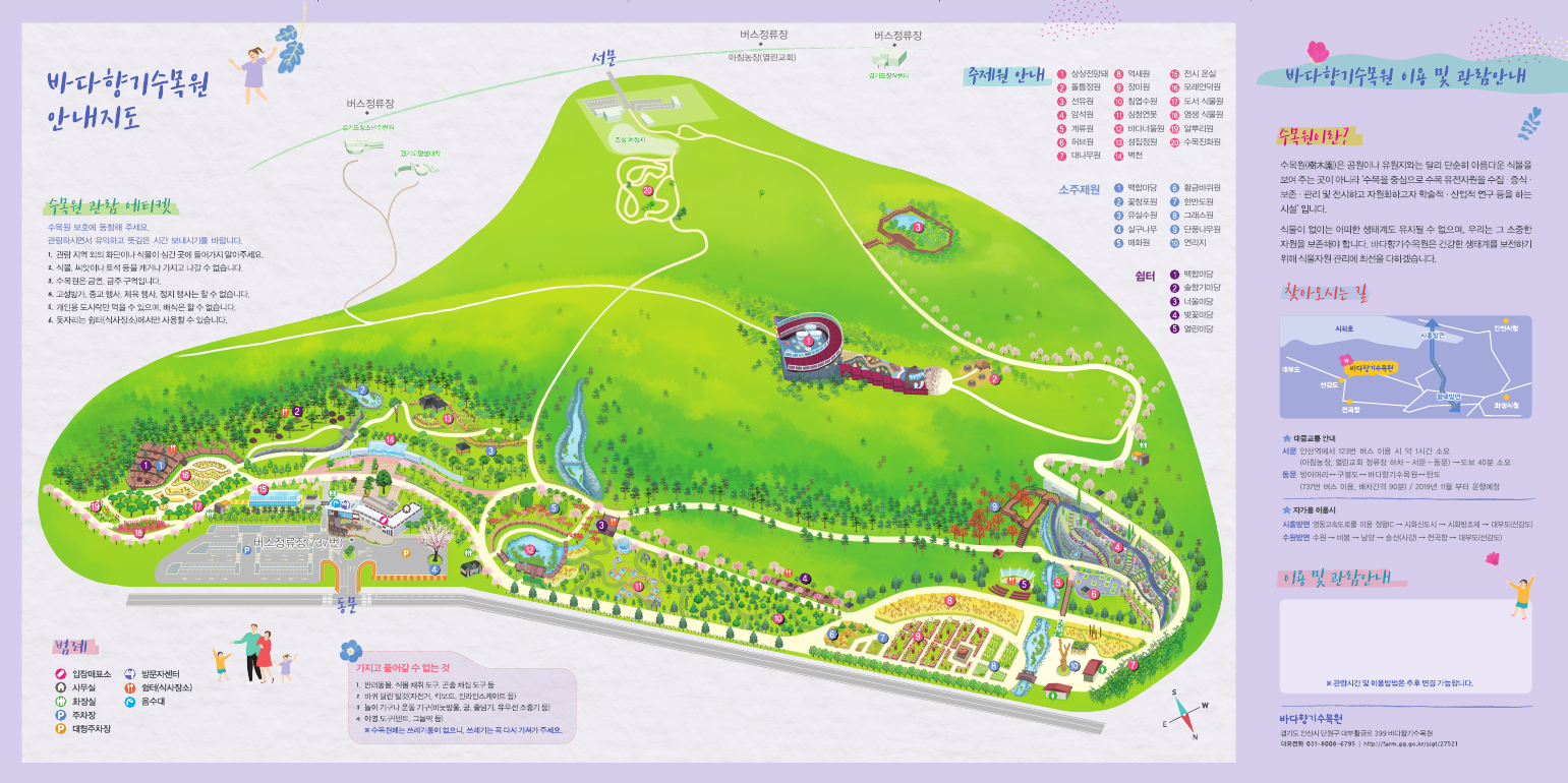 아래는 바다향기수목원 안내 지도예요. 주요 시설은 방문자 센터, 상상 전망대, 암석원 등이 있고 1,000여 종 30여만 그루 식물들이 있어요. 킥보드, 인라인스케이트 등 바퀴 달린 탈것이나 반려동물, 식물 채취 도구, 곤충 채집 도구 등은 가지고 들어갈 수 없어요.