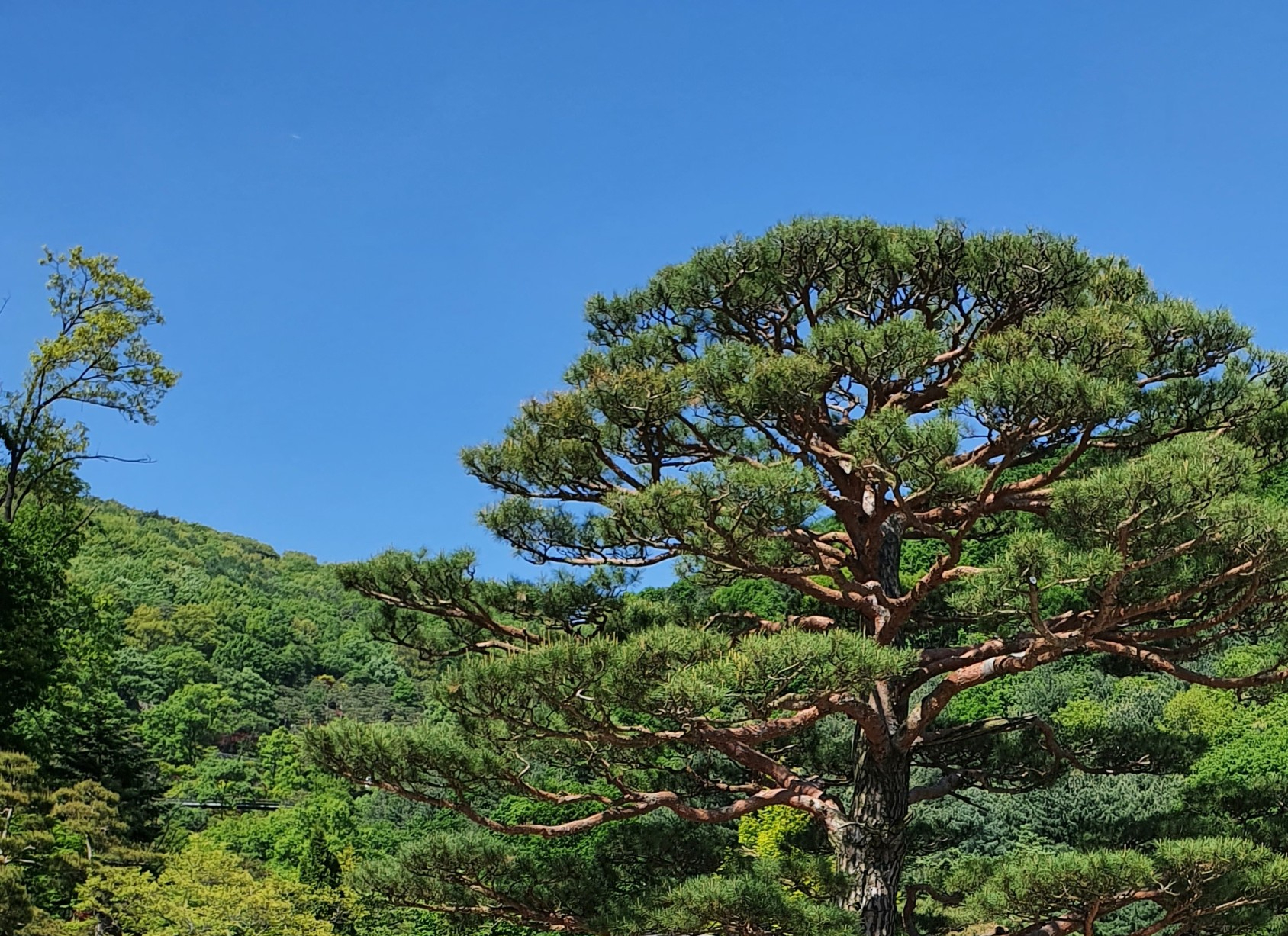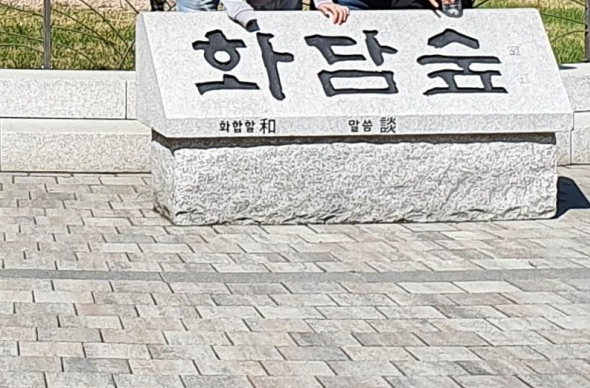 입구에 들어서자마자 화담숲을 대표하는 큰 소나무가 있어요. 화합할 '화(和)'와 말씀 '담(談)', '화담'은 정답게 이야기를 나누다는 뜻으로, 이름 그대로 녹음 우거진 숲을 걸으며 정답게 이야기 나눌 수 있는 곳이에요. 화담숲이라는 글씨가 보이는 큰 소나무 아래에서 사진 찍고 있는 분들이 많았어요.