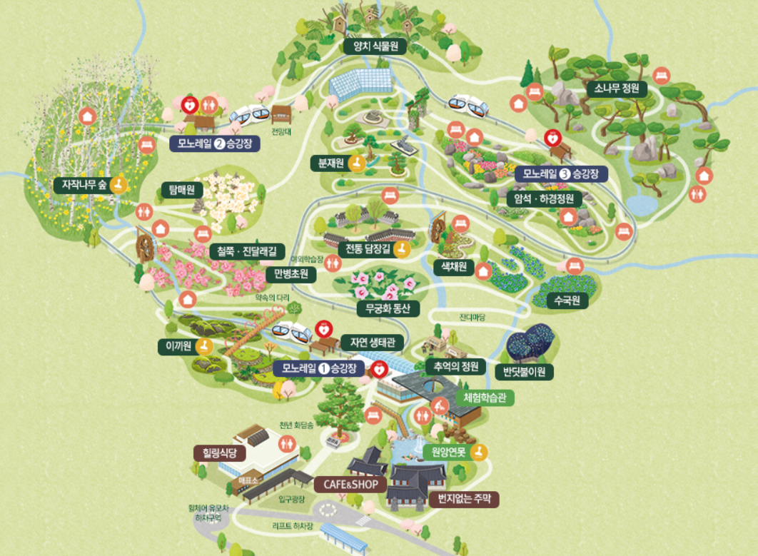 화담숲은 도보로 약 120분 정도 걸려요. 그래서 도보를 하며 모노레일을 이용하시는 분들이 많은데, 모노레일 이용 시 하차하는 승강장에 따라서 관람 소요 시간은 60분~90분 걸려요. 모노레일로 순환하여 모두 관람하면 약 20분 관람 시간 소요되니 참고하세요.