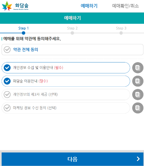 1. 온라인 예매 -> 2. 입장권 클릭 -> 3. 예매하기 클릭 -> 4. 약관동의 -> 5. 이용일, 이용시간 등 선택
