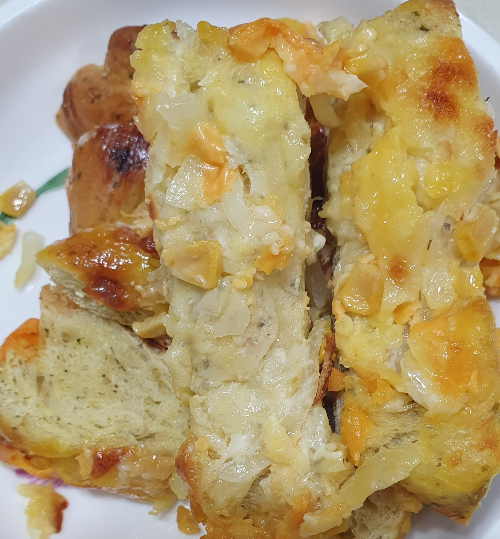 양파빵은 잘라서 먹어 본 후 사진을 찍었는데, 이름 그대로 양파와 옥수수가 들어간 빵이라고 생각하시면 돼요. 야채빵 같은 건강한 맛이에요.