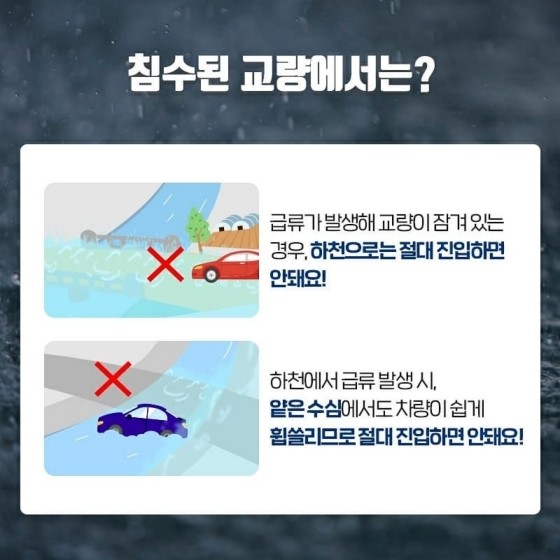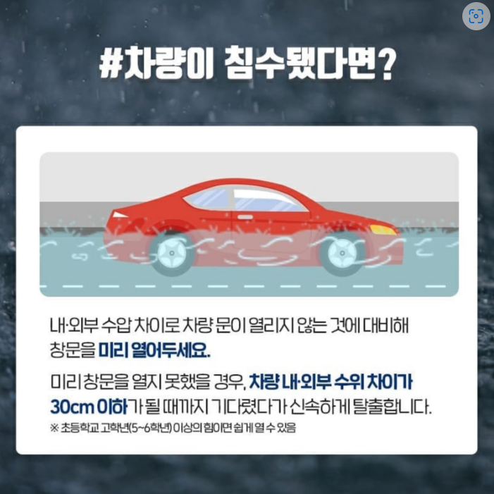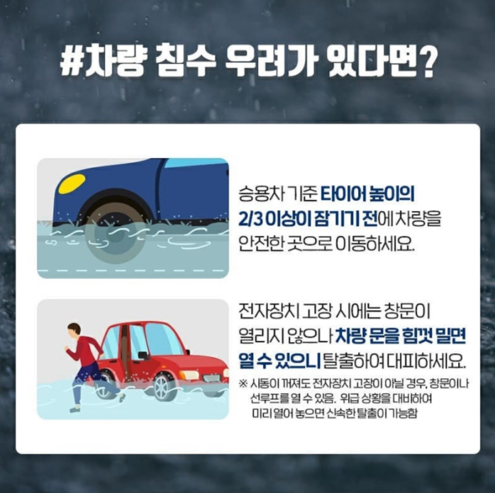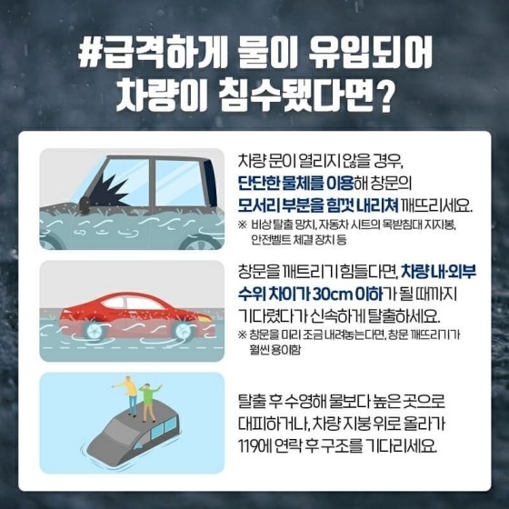 집중호우 시 차량 침수 대비 꼭 기억해야 할 행동수칙 숙지하신 뒤 당황하시지 말고, 침착하게 행동하세요.