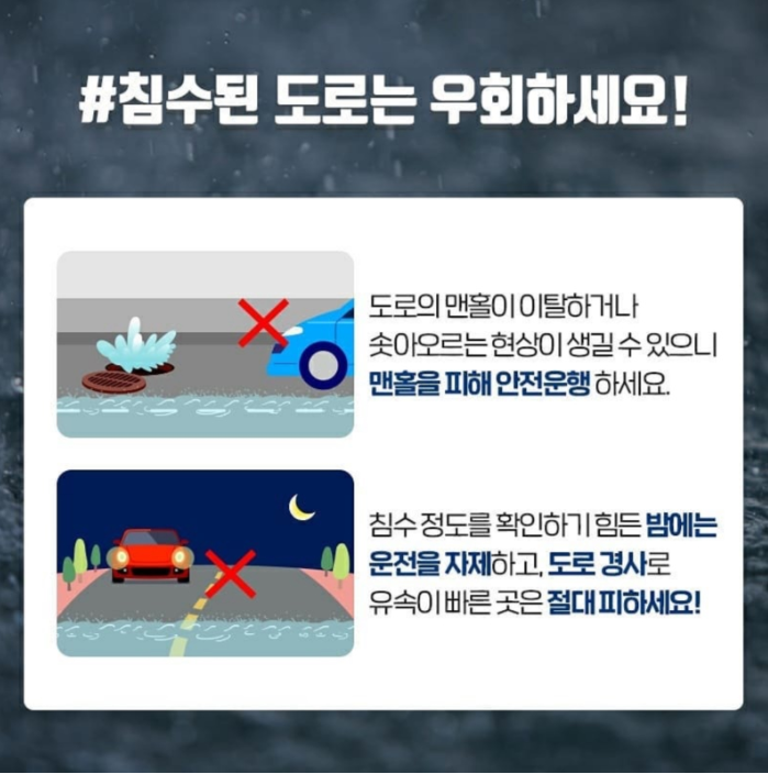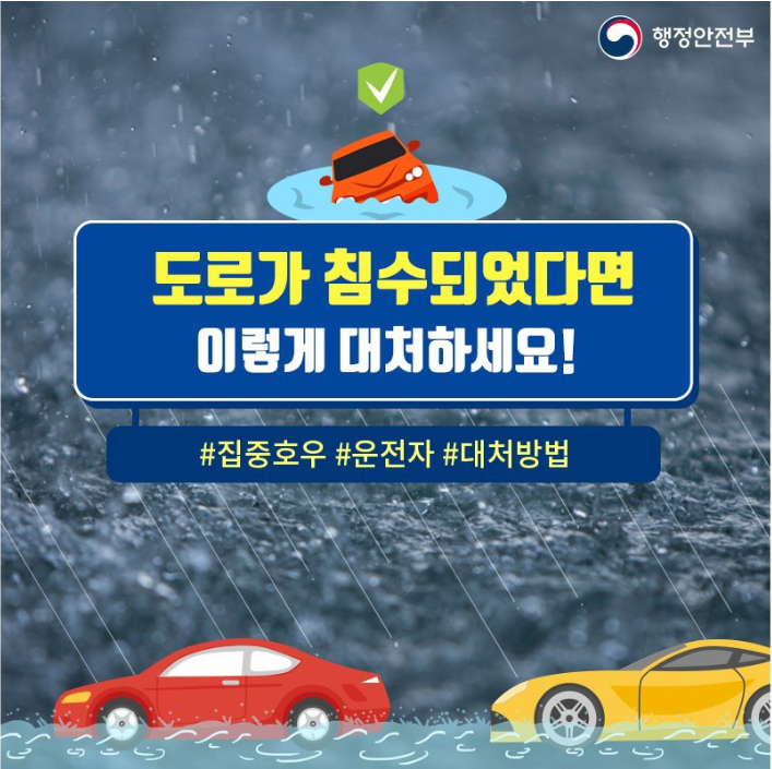 도로가 침수되었을 때 운전자 대처방법이에요. 어제도 갑자기 비가 많이 내려 침수된 차량이 많았는데 너무 안타까운 마음이 듭니다. 도로 침수 시 차량에 타고 있을 경우에는 속도를 줄여 운전하고, 개울가나 하천변, 해안가 등 급류에 휩쓸릴 수 있는 지역이나 침수 위험지역은 접근하지 않아야 해요. 일단 침수된 도로나 지하차도, 교량 등은 아예 진입하지 않는 것이 좋아요. 이런 일이 없어야겠지만 차량 침수 우려가 있거나 차량이 침수되었다면 차량 문이 열리지 않을 것을 대비해 미리 창문을 열어놓는 등의 아래 내용의 방법으로 안전하게 대처하세요.