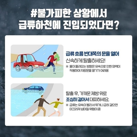 불가피한 상황에서 급류 하천에 진입했다면 아래 방법 숙지하셔서 신속하게 탈출하셔야 해요.