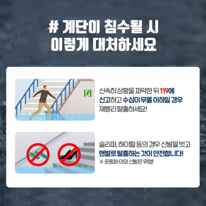 집중호우가 내리면 기상 정보를 확인하며 안전한 실내에 머물러야 해요. 저지대나 상습 침수지역, 산사태 위험지역, 지하 공간이나 붕괴 우려가 있는 노후주택과 건물에 있다면 즉시 안전한 곳으로 이동하고 건물 출입문과 창문은 닫아 파손되지 않도록 해야 해요. 가스, 전기사고 등 2차 피해에도 유의해야 해요. 아래 내용 확인하시며 침수 계단이나 침수 공간에서의 상황별 대처 요령 꼭 기억하세요.