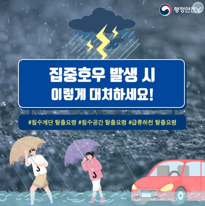 어제부터 많은 비가 내리고 있네요. 서울에 기록적 폭우가 쏟아지고 자정을 넘어서는 경기 남부에 비가 집중됐죠. 산사태 위기경보 등 안전 재난 문자도 많이 오는 날들입니다. 중부지방에 계속 비 소식 있는데, 오늘은 집중 호우 발생 시 대처하는 방법을 알려드리려고 해요. 행정안전부 홈페이지에 서 집중 호우 관련 자료를 검색하다가 모두가 알고 대처하면 좋은 내용이기에 포스팅합니다.