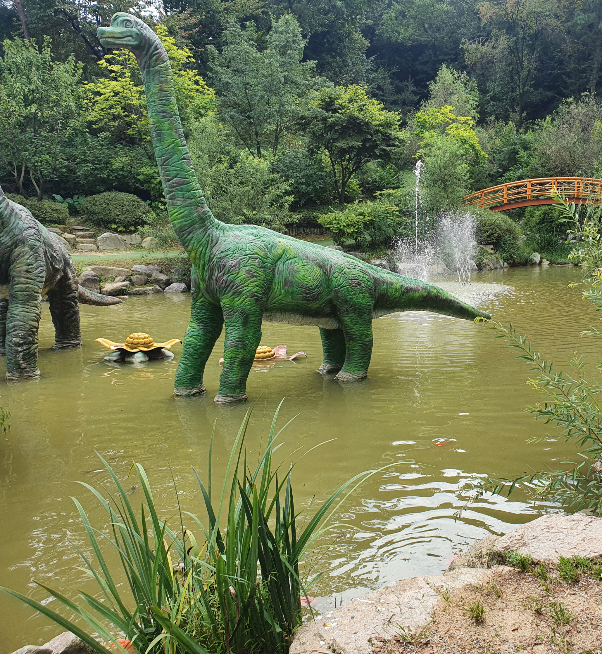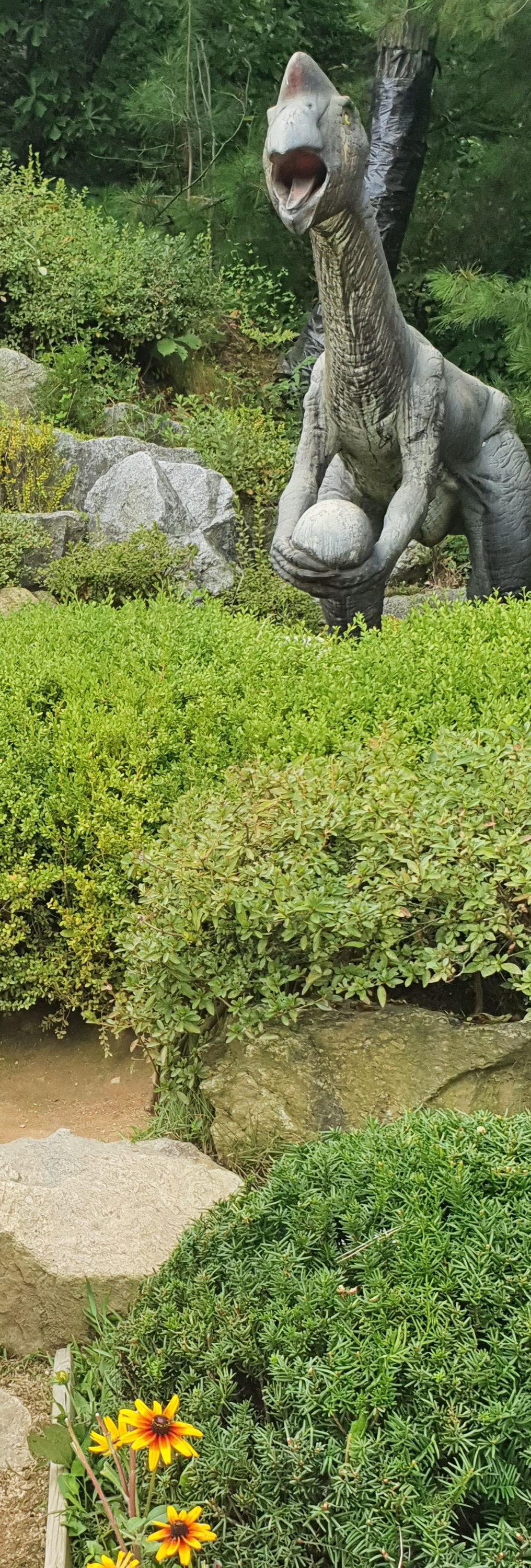 덕평 공룡원수목원에 들어서자마자 브라키오사우르스가 보여요. 도담 연못 위 거대한 브라키오사우르스 모형이 시선 집중되고, 연못에는 분수도 있고 물고기도 있어요.