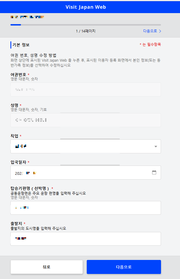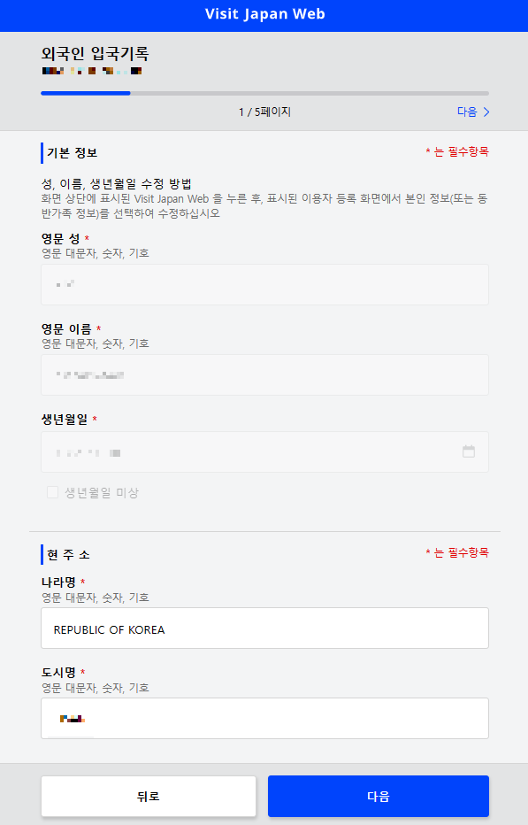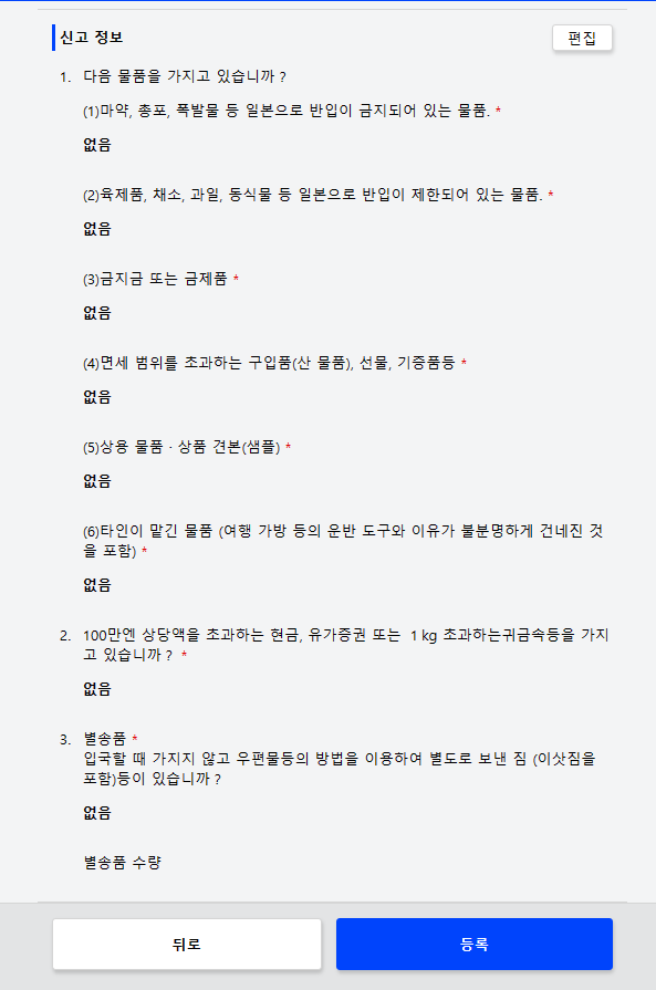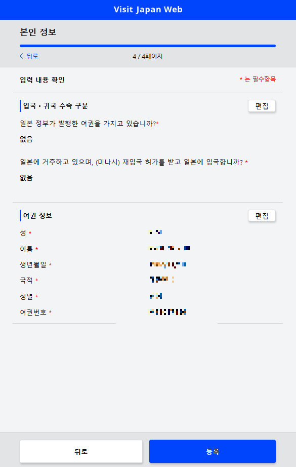 - 검역 수속(패스트 트랙) 버튼을 클릭하고, 기본 정보 입력.