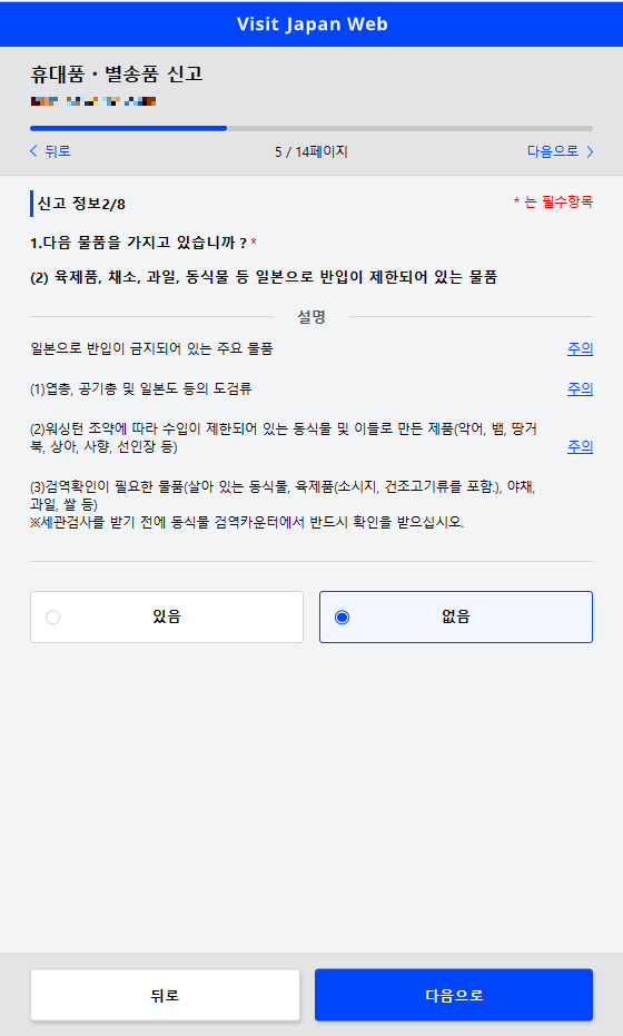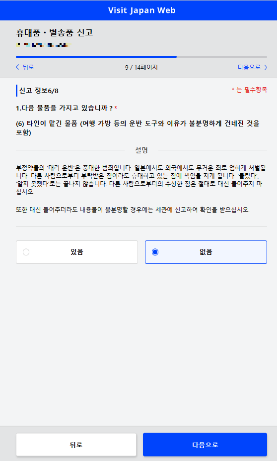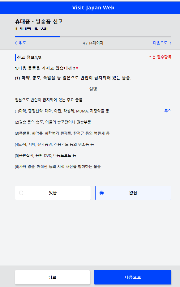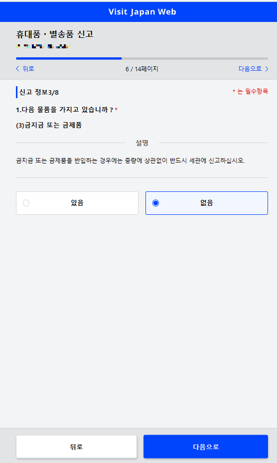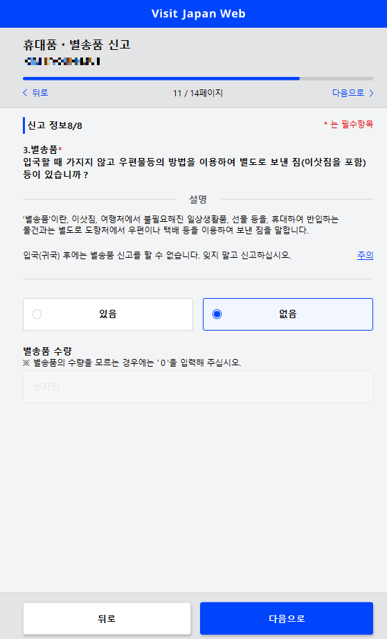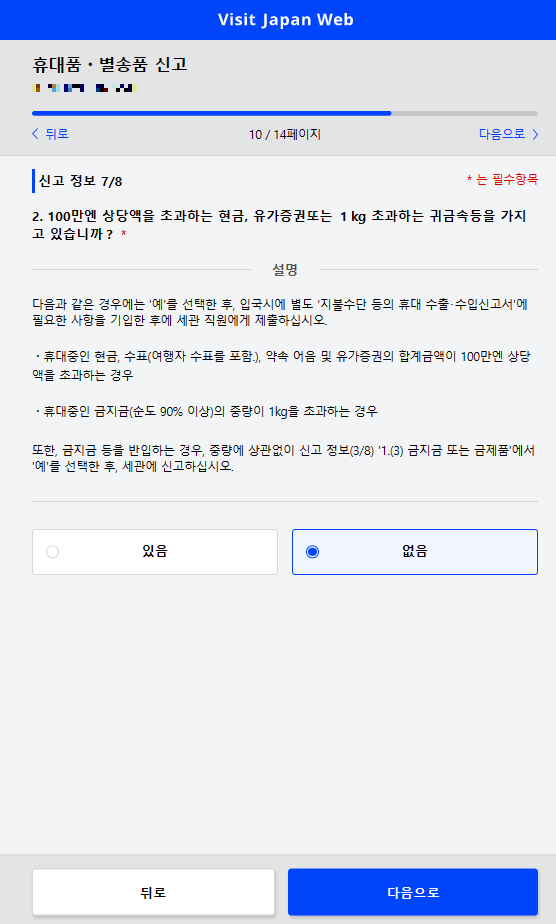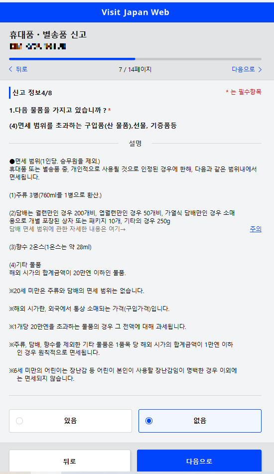 - 위의 절차를 모두 마무리했다면 세관신고(휴대품, 별송품 신고) 버튼 클릭! (무려 14페이지 질문이 등장합니다)