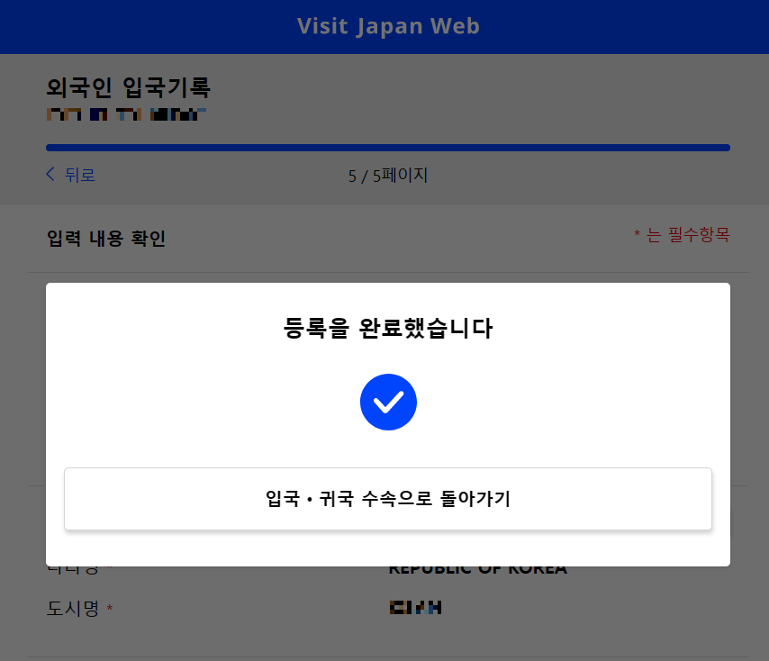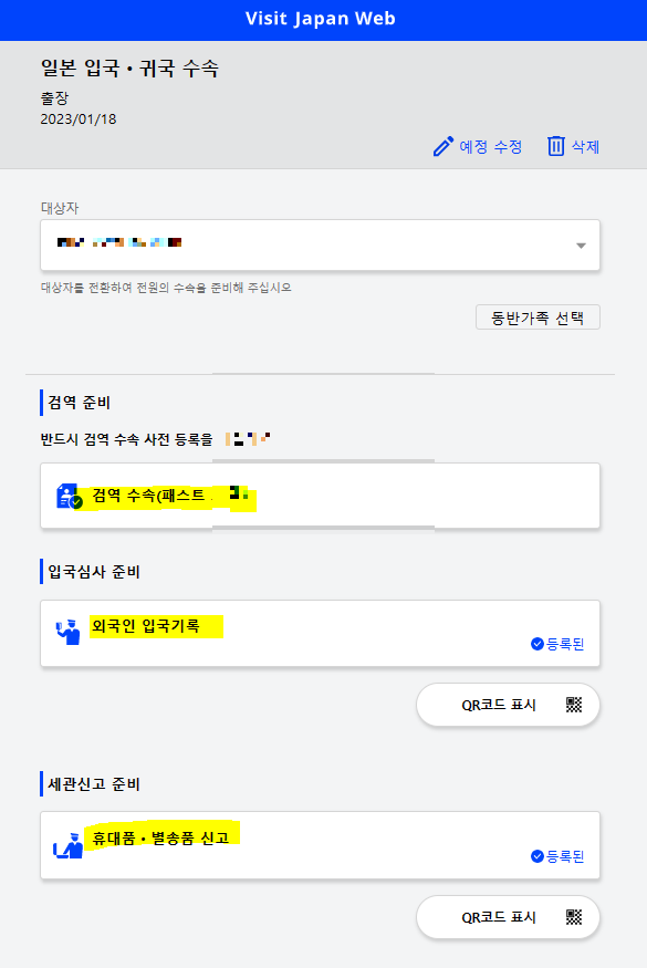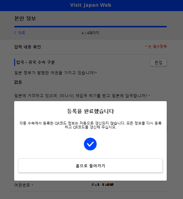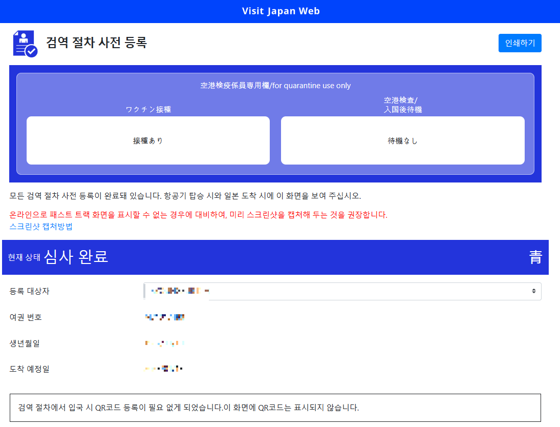 일정시간이 지난 후, 사전 등록되었다는 메일을 수령하였고, visit japan web 사이트에 가서 보니 아래와 같이 파란색 글씨 "등록된"으로 바뀌었음을 확인했어요(최초 빨간색 글씨로 "미등록"이라고 되어 있었음).