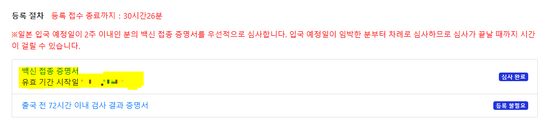 - 3차접종 백신 접종 증명서가 없을 경우, 출국 전 72시간 이내 검사 결과 증명서 첨부.