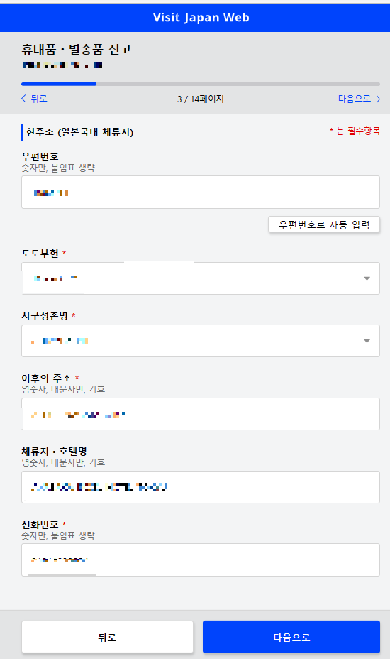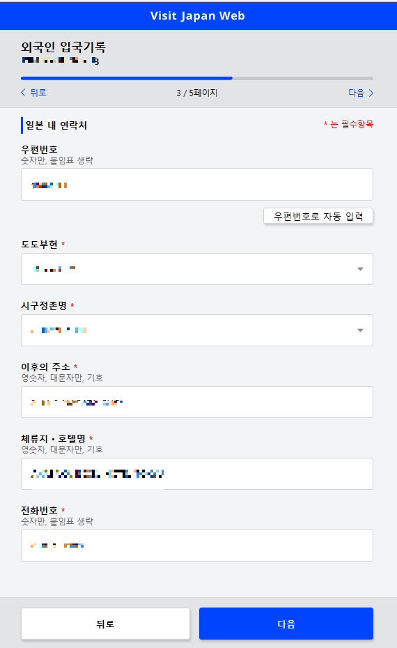 - "일본 내 연락처"에서 일본에서 체류할 호텔 우편번호를 입력하고, 우편번호로 자동입력 클릭!