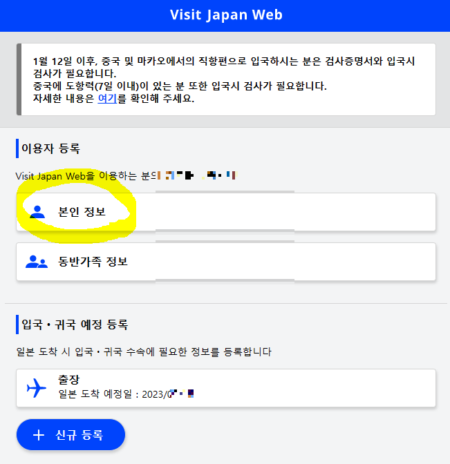 3. "본인정보" 입력 후, 입국/귀국 예정 등록:
