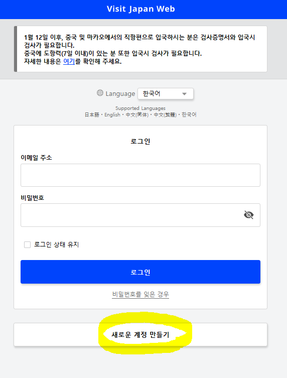 - 위의 visit japan web으로 접속 후, "새로운 계정 만들기" 클릭 후 회원 가입 진행.