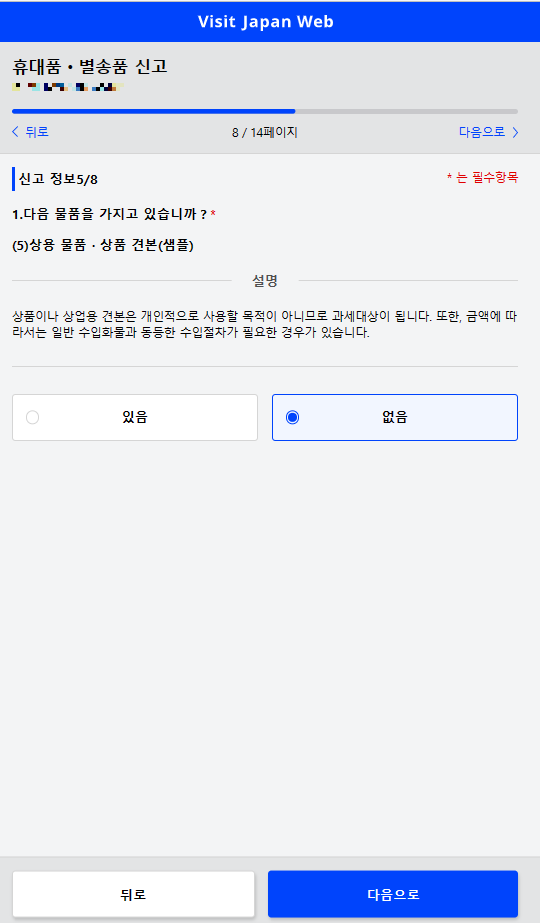 - 위의 "도항 목적"에서 저는 출장으로 가는 거라 "상용" 체크했어요.