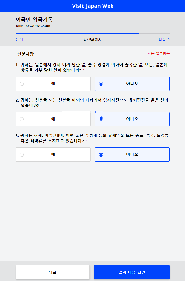 - 위의 내용까지 작성 후, "입력 내용 확인" 버튼을 누르고 입력내용을 확인한 후 "다음" 버튼을 누르면 외국인 입국기록 절차는 마무리됩니다.
