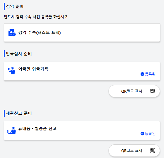 이 세가지를 작성 완료하고 QR 코드를 각각 확보하면 사전등록절차는 완료가 돼요.